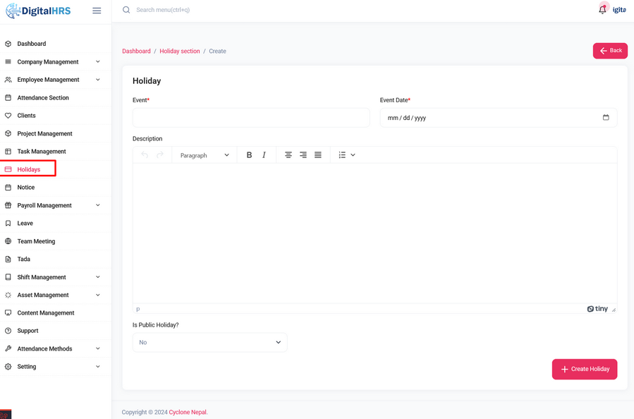 Once all details are entered, click on the "Create Holiday" button to add the holiday to the system.